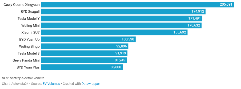 En neuvième position, la Geely Panda Mini est à 670 unités derrière, ayant atteint 91 249 livraisons au premier semestre 2025. Elle a obtenu une part de marché de 2,6 % des BEV.