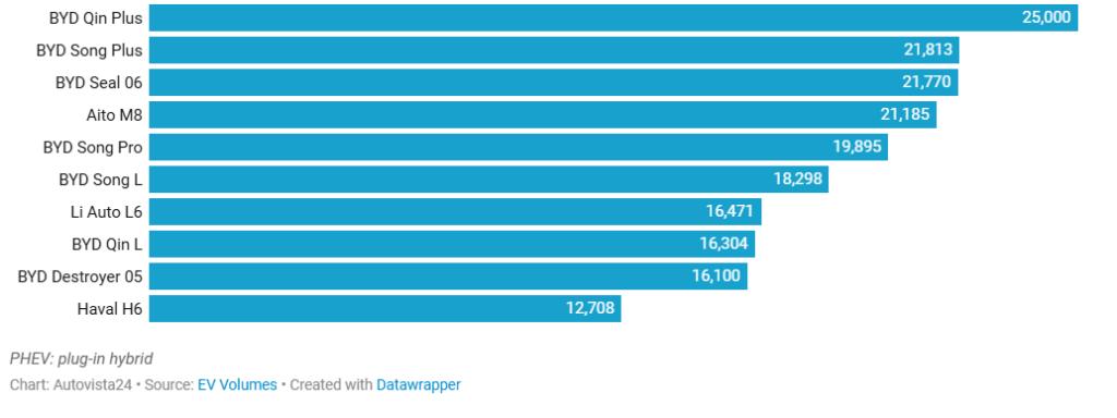 Deux modèles se partagent la dixième place, chacun ayant atteint un résultat record lors de son quatrième mois de ventes. Il s’agit de la BYD Sea Lion 05, qui fait sa première apparition dans le top 10, et de la BYD Qin L. Les deux ont enregistré 15 000 livraisons en juin, soit une part de marché de 2,2 %.